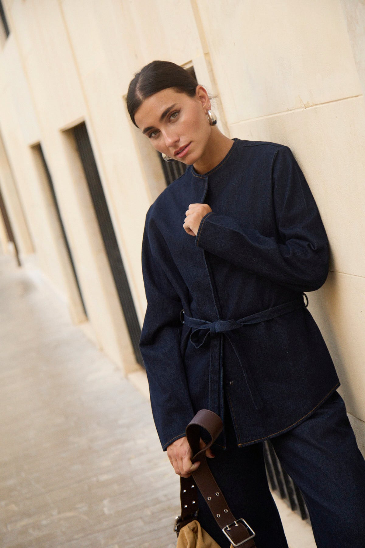 Sobrecamisa denim. Escote redondo y manga larga holgada. Cierre con corchetes ocultos y lazada a la cintura.